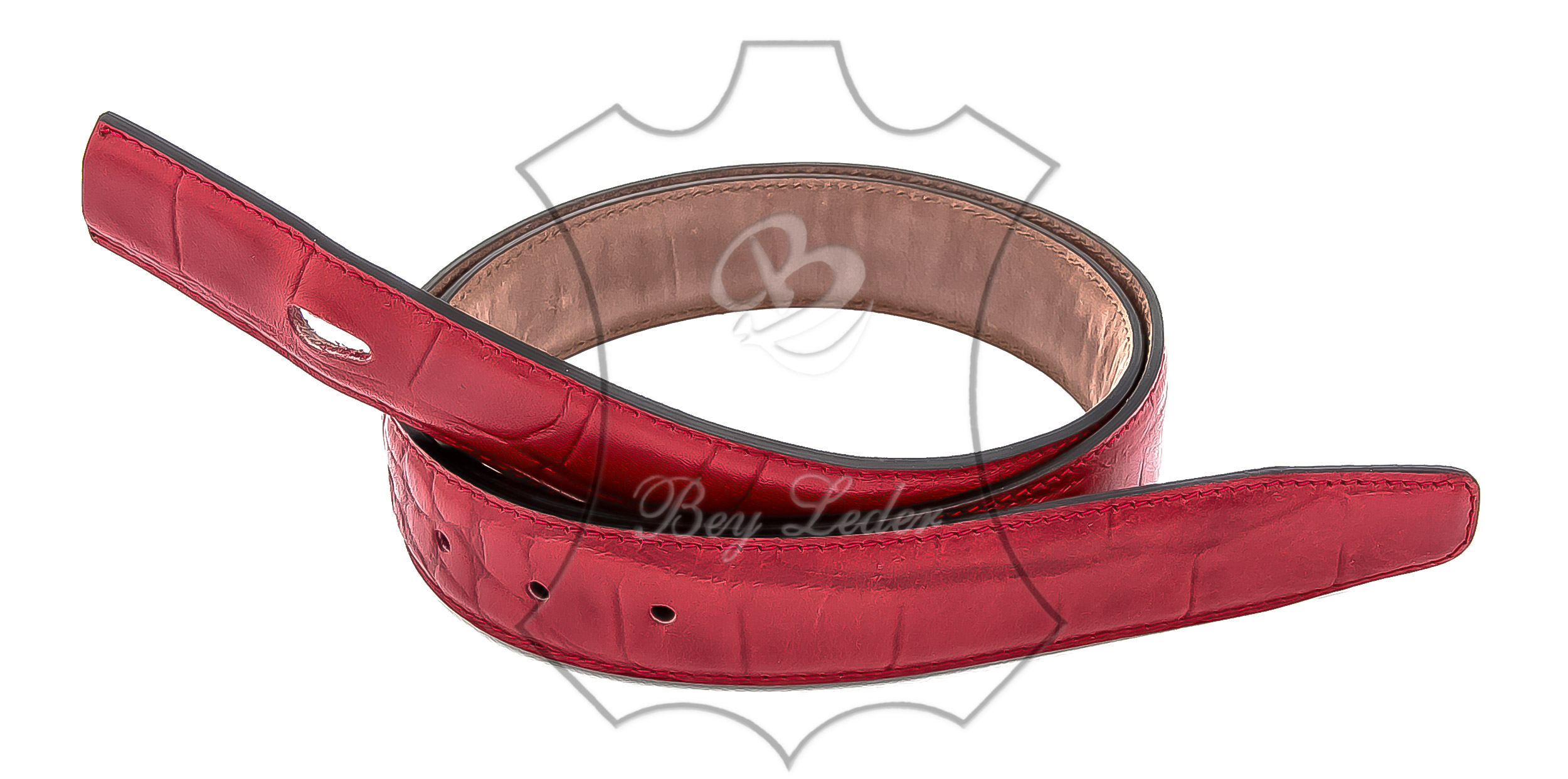 | Gürtel-Krokorot - Breite 3,8 cm - von Größe 60 cm bis 100 cm - aus Nappaleder Zwei Kalbslederstreifen mit Nappaverarbeitung zusammengeklebt und an den Seiten zusammengenäht. OHNE SCHNALLE | ||