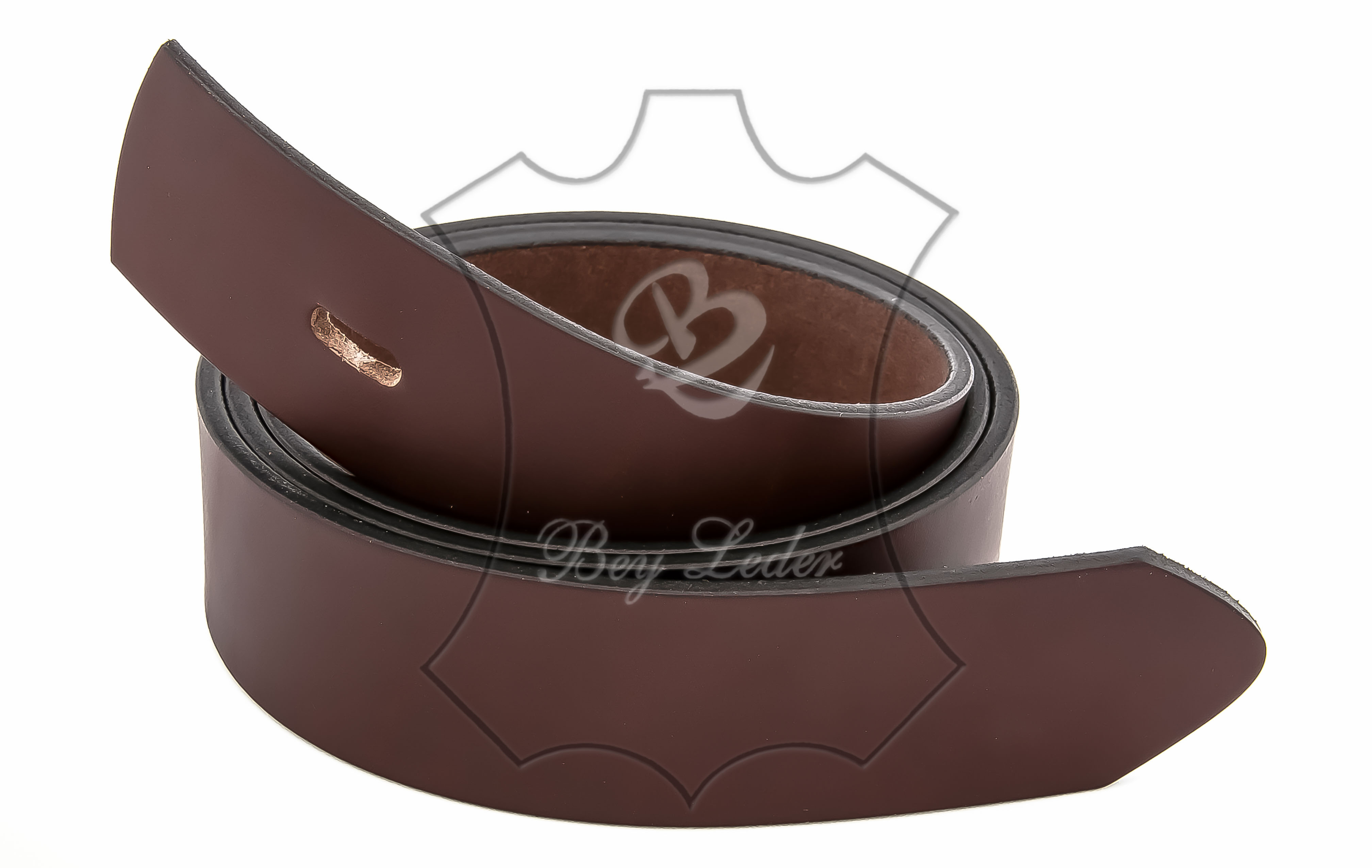 | Gürtel- mokkabraun glatt - Breite 3,8 cm - von Größe 60 cm bis 135 cm - aus Rinderleder - durchgefärbt OHNE SCHNALLE | ||