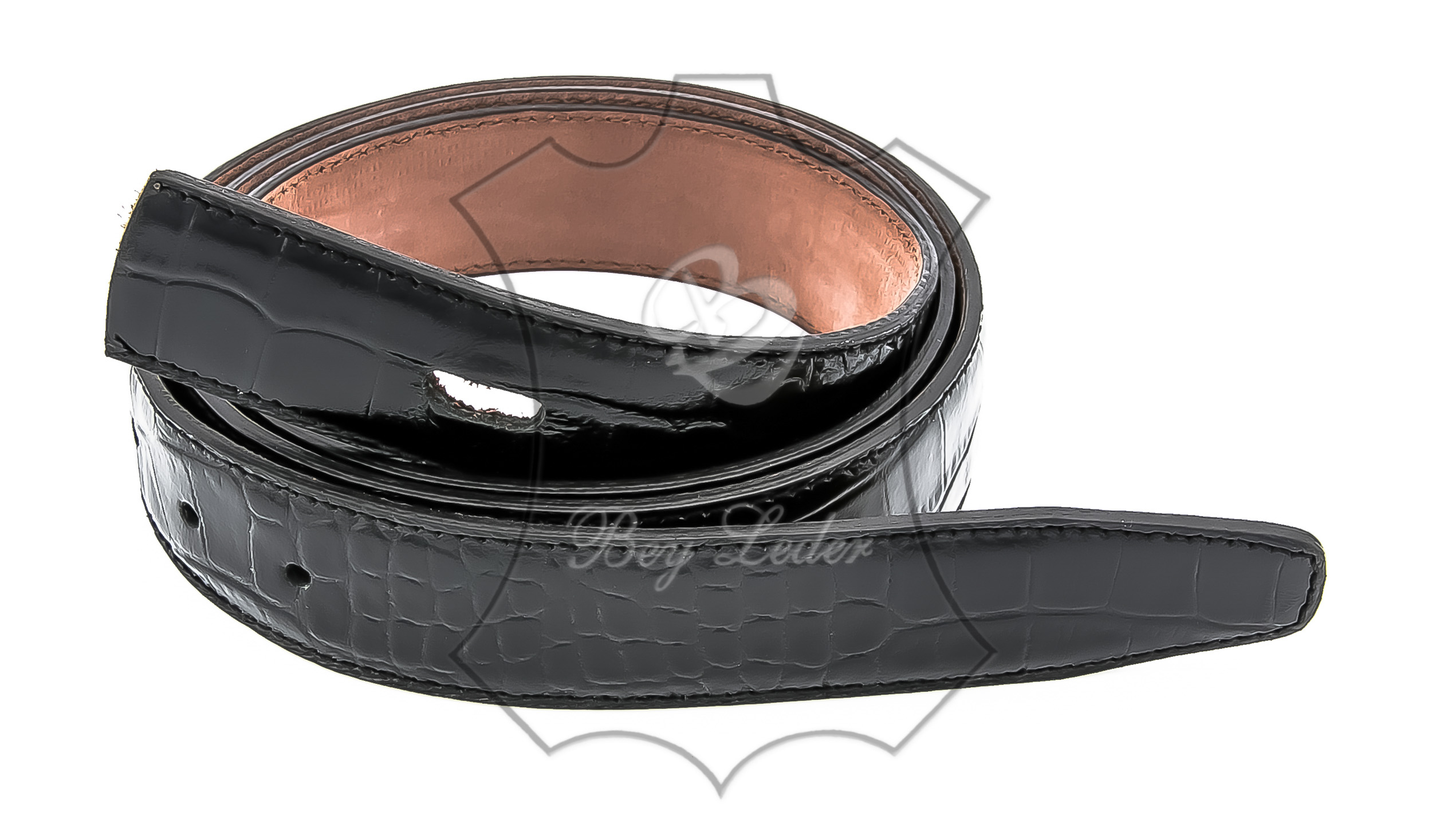| Gürtel-Krokoschwarz - Breite 2,8 cm - von Größe 60 cm bis 130 cm - aus Nappaleder Zwei Kalbslederstreifen mit Nappaverarbeitung zusammengeklebt und an den Seiten zusammengenäht. OHNE SCHNALLE | ||