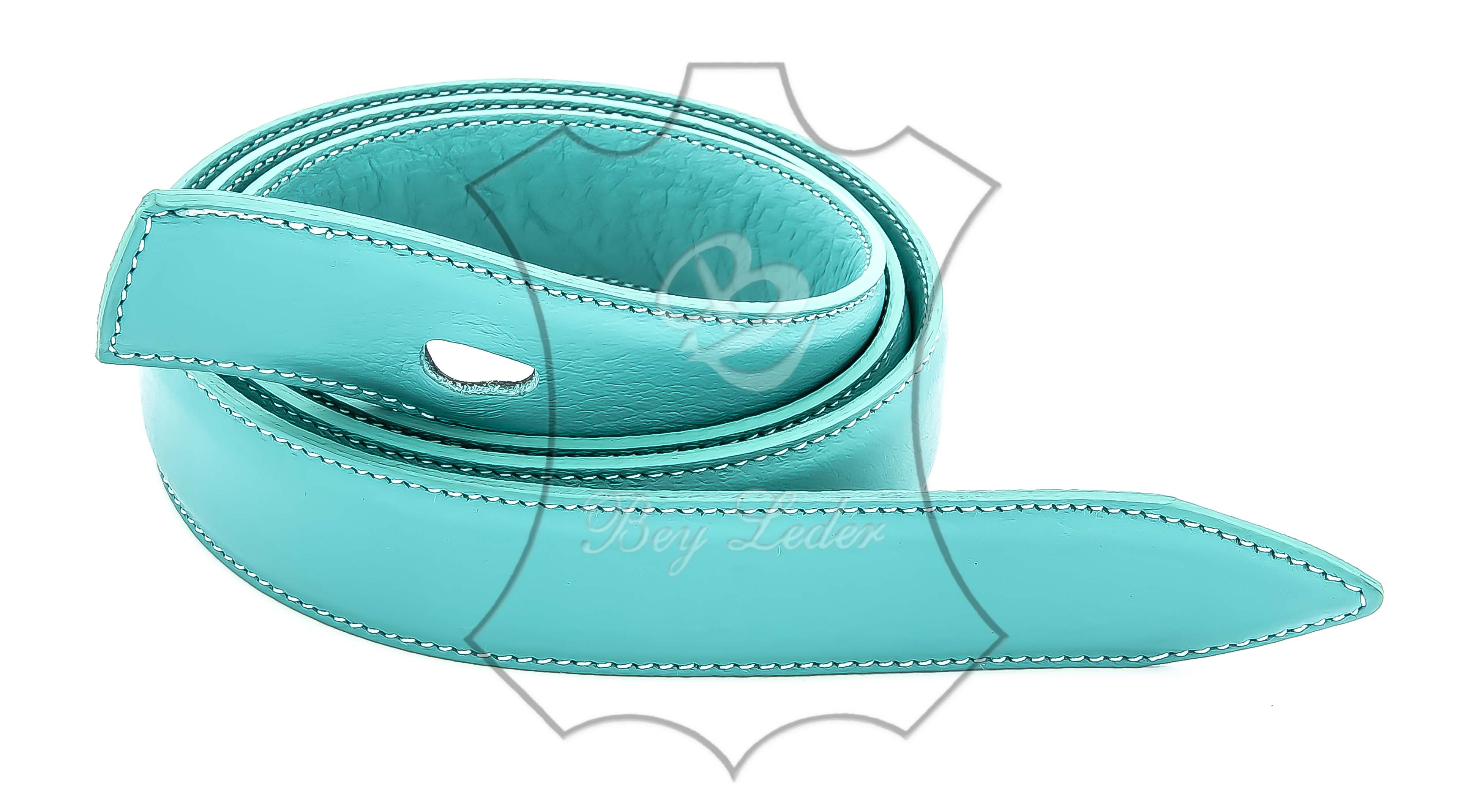 | Gürtel-türkis - Breite 2,8 cm - von Größe 60 cm bis 130 cm - aus Nappaleder Zwei Kalbslederstreifen mit Nappaverarbeitung zusammengeklebt und an den Seiten zusammengenäht. OHNE SCHNALLE | ||